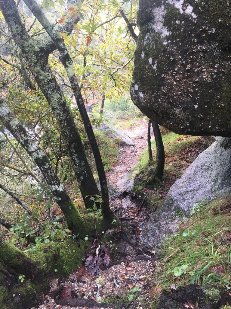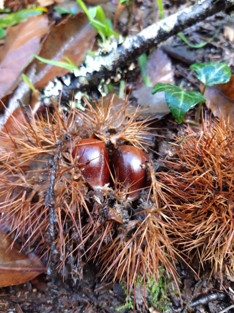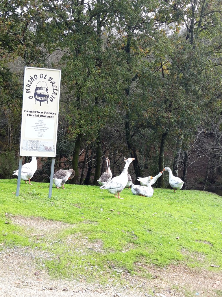 Per Zufall entdeckten wir unweit von Santiago de Compostela ein romantischer Ort mit Wandermöglichkeiten am Rio Barosa. Das lassen wir uns nicht entgehen. Der Weg beginnt hinter der Brücke gleich beim grossen Wasserfall. Der schmale Weg führt uns durch dickes Dickicht und Felsen. Ein Sprung und die Hosen sind nass und zerrissen, oje und alles wegen diesem doch sehr anspruchsvollen Wanderweg durch das Dickicht. Alles dem Bach entlang bis zu einer Lichtung. Gut versteckt entdecken wir ehemalige Mühlen, Häuser und mit Moos überwachsene Mahlsteine. Unweit von unserem Fundort quaken Gänse. Was ist den das? Eine superschöne Strasse führt zum gleichen Ziel. Also haben wir doch den falschen Weg gewählt? Nochmals über eine Brücke und wir wandern weiter durch den Wald. Ein Wanderzeichen bestätigt uns, dass wir auf dem richtigen Weg sind. Doch was ist das nun? Ein umgestürzter Baum versperrt uns den Weg. Wieder ein Sprung über ein Bächlein, doch dieses Mal klappte es. Nach diesem Hindernis werden wir mit feinen essbaren Kastanien belohnt. Wir füllen unseren Rucksack. Mei, gibt das ein feiner Schmaus! Bald führt uns der Weg wieder über eine Brücke und zur Strasse. Diese führt uns wieder zum Ausgangspunkt. So jetzt git’s heissi Marroni!