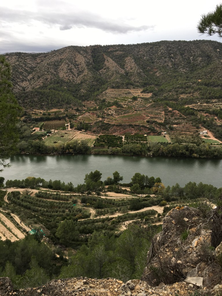 Wir folgen dem Ebro. Es windet heftig, die Strasse (C12) führt uns bergauf und bergab jedoch immer dem Ebro entlang. Gleich bei der nächsten Biegung finden wir einen Parkplatz mit Übernachtungsmöglichkeit. Da stellen wir uns hin. Wir steigen aus dem Womo. Halte bitte die Türe, sonst knallt sie ….! schreie ich, doch schon zu spät. Der Wind reisst die Türe förmlich aus der Hand und sie prallt mit voller Wucht an die Womo-Aussenwand. Glück gehabt, ausser einem Schrecken ist nichts passiert. Tief unter uns schlängelt sich der Ebro durch die Landschaft. Der Ebro ist mit seinen 910Km der zweitlängste Fluss von Spanien. Auf der gegenüberliegenden Seite steht ein Bauernhof mit Weinreben. Bald gesellen sich noch 2 LKWs zu uns hin. Ziemlich knapp der Parkplatz. Einer der LKWs findet das auch und fährt weiter. Bald schon ist der freigewordene Platz von einem anderen Womo besetzt.