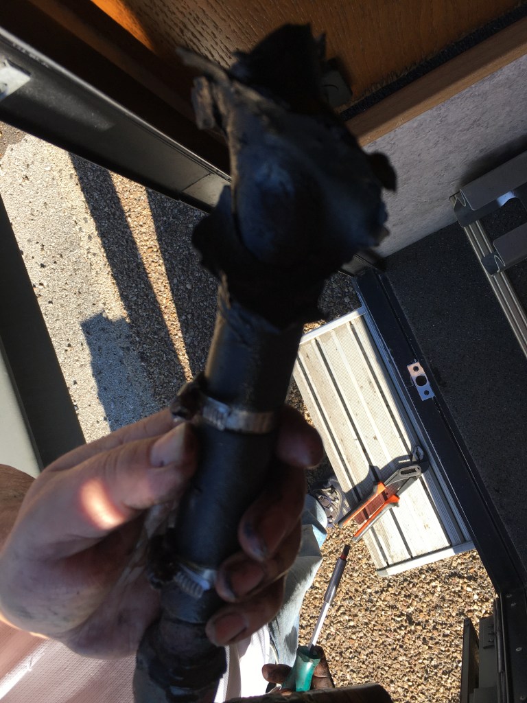 Plötzlich leuchtet die rote Lampe im Armaturenbrett auf…was ist jetzt wieder los? Die Wasserlampe leuchtet auf, wir halten auf dem Pannenstreifen an. Im Rückspiegel sehen wir wie Kühlerwasser ausläuft. Schnell ist klar was die Ursache ist, ein poröser Wasserschlauch. Dabei haben wir die MAN-Garage ausdrücklich gebeten ALLE Wasserschläuche auszuwechseln. Der ging wohl vergessen. Nach ca 40 Minuten ist der Defekt behoben.