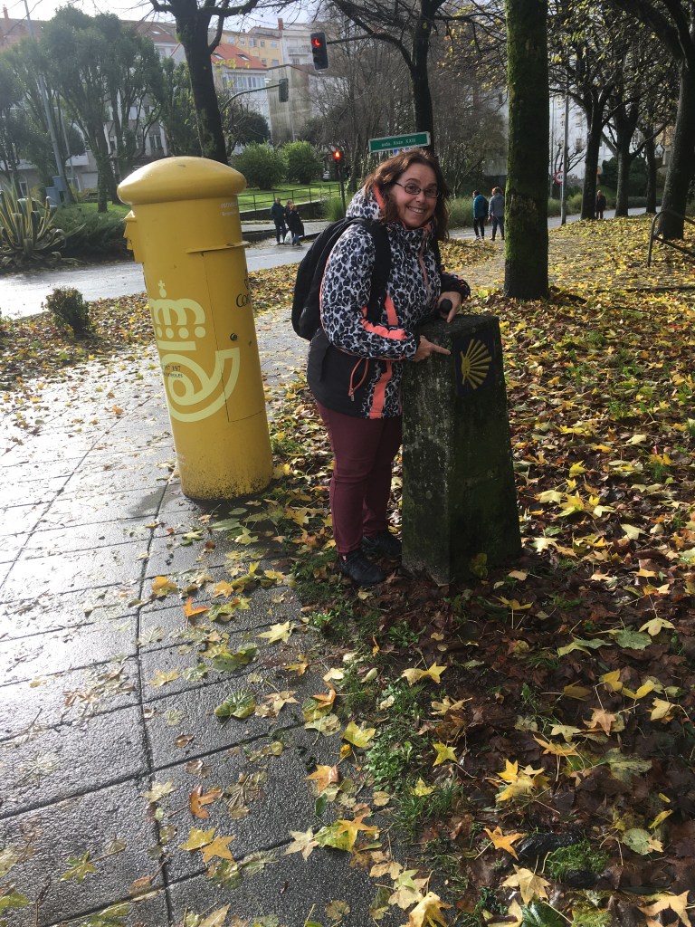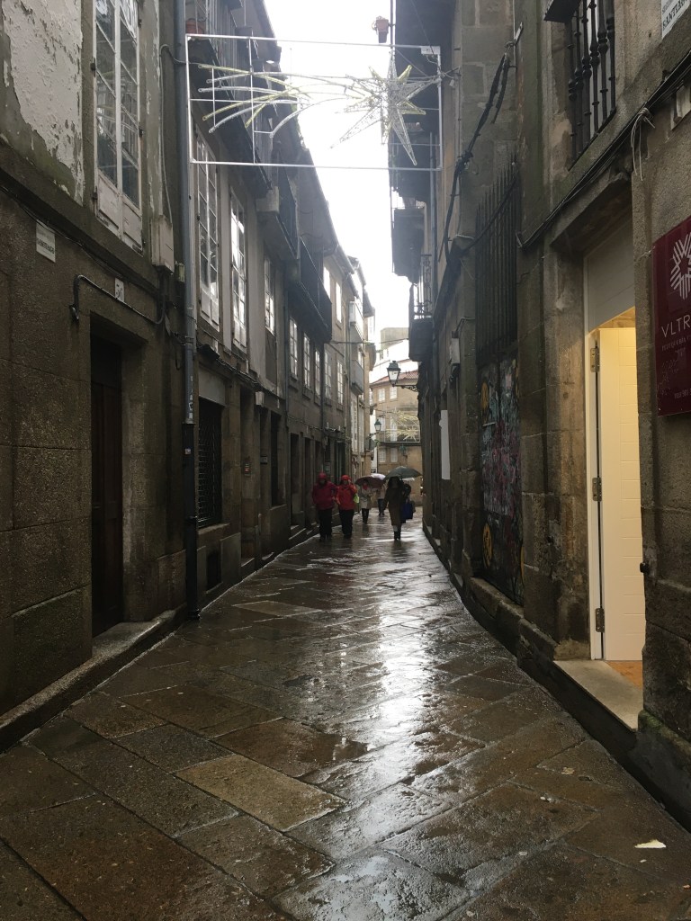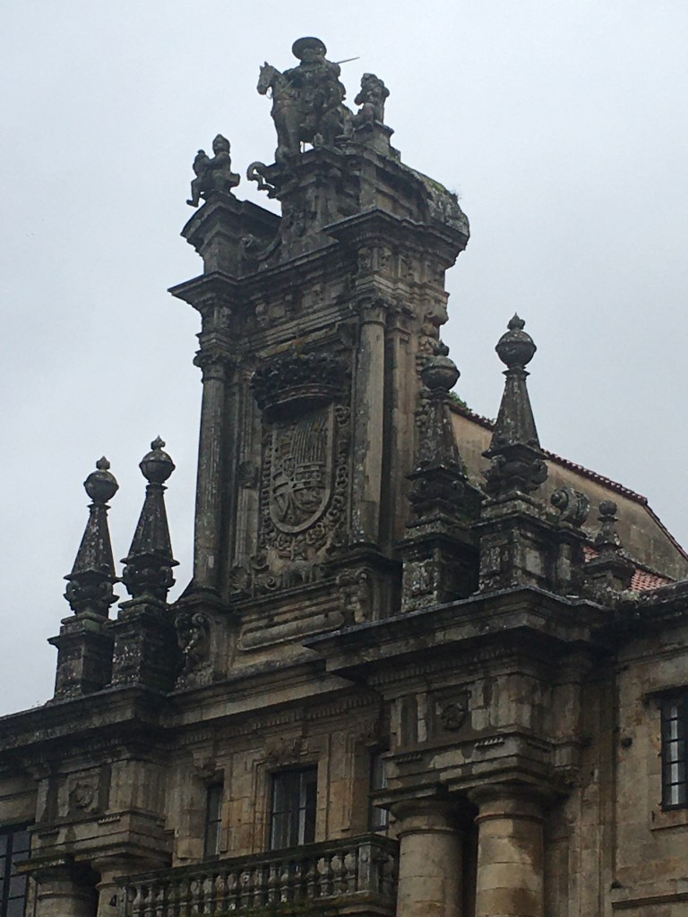 Wir verlassen das regnerische Städtchen und übernachten unterwegs. Nochmals führt die Strasse hinauf ins nicht mehr so hohe Kantabrische Gebirge bis wir endlich Santiago de Compostela erreichen. . Wir stellen unser Womo auf den grossen Parkplatz und machen uns zu Fuss auf den Marsch zu Innenstadt. Einigen Pilgern begegnen wir. Ob zu Fuss, per Rad oder Auto man erkennt sie sofort. Regenschirm/-jacke, Rucksack, Fotoapparat und den Zeichen der Jakobsmuschel folgend.