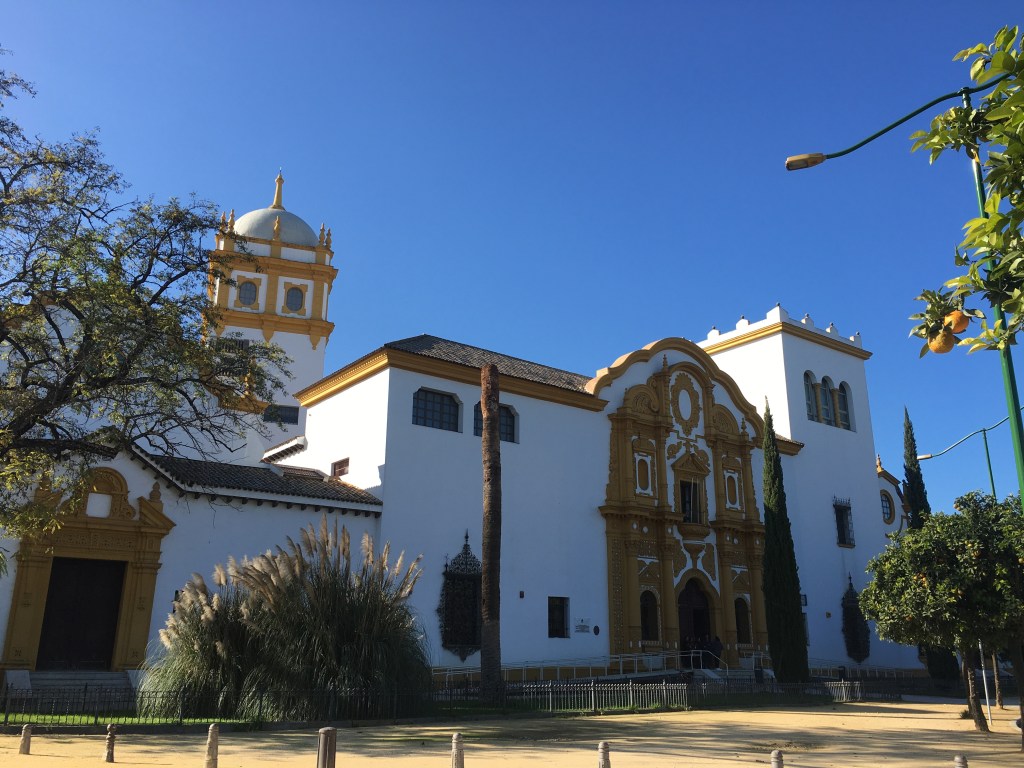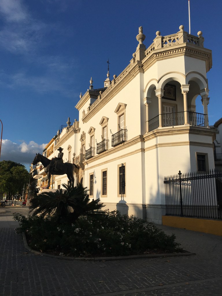 Unweit von der Parkanlage befindet sich der Palacio de San Telmo. Auf dem Radweg weiter geht’s auf die Bahnhofstrasse oder wir nennen sie mal so. Hier fährt das Tram und sie gehört zum Stadtzentrum. In einer Bäckerei können wir nicht widerstehen und kaufen uns einer der Leckereien. Gleich rechts um die Ecke steht die Kathedrale in voller Pracht. Die vielen Türme und das Geschnörkel, einfach Wahnsinn. Wer musste da oben wohl arbeiten? Die Steine und Monumente hochheben? und das alles ohne unsere heutigen Kräne. Ein echtes Kunstwerk! Die Stadtmauer scheint aus einer anderen Epoche zu stammen, nämlich von 100 v.Chr. von Julius Cäsar erbaut. Danach wurde sie immer wieder neu aufgebaut – erhöht und erweitert, dann wieder durch Kriege zerstört. Die nächste Strasse links und wir befinden uns auf einer mit Pflastersteinen gebaute enge Gasse. Hier möchte ich nicht mit unserem Womo durchfahren müssen. Viel zu eng! Endlich den Ausweg aus diesem Gassen-Labyrinth gefunden und wir stehen vor dem nächsten eindrücklichen Gebäude. Die Corrida del Torro oder Stierkampfarena. Sie ist die zweitgrösste Arena von Spanien und ist ellipsenförmig angelegt. Zwei Pedalen Tritte weiter und der Torre del Oro steht vor uns. Von da ist es nicht mehr weit zu unserem Womo-Stellplatz. Kurz vor der Dunkelheit sind wir wieder Zuhause.